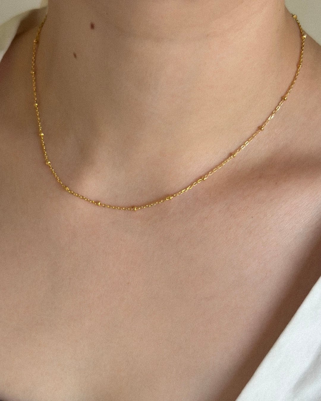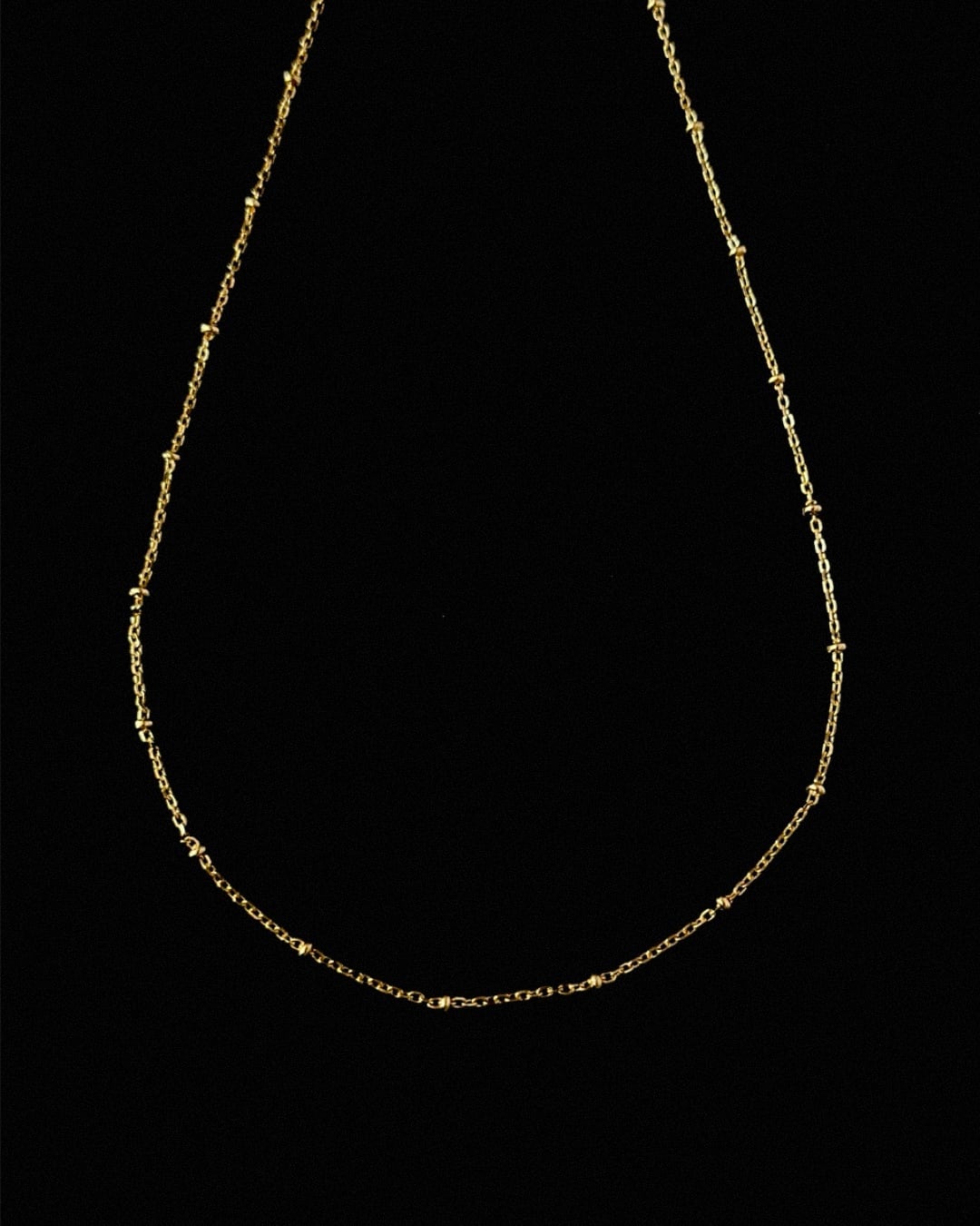小粒のドットが連なるユニークなチェーンネックレス 5cmのアジャスター付きのため短めのチョーカーサイズから お洋服の上からでもご着用いただける長さまで調整が可能です ネックレスチェーン単体でも チャームシリーズと組み合わせても 様々なご着用方法でお楽しみいただけます material K18 gold plated (silver925) size(約) 37-42cm